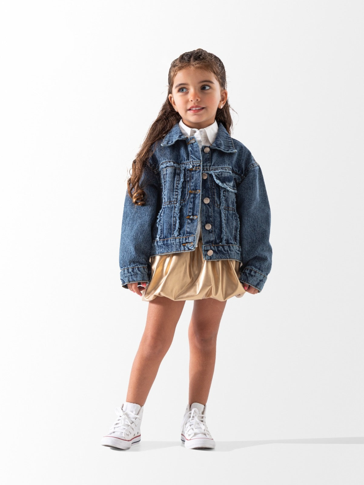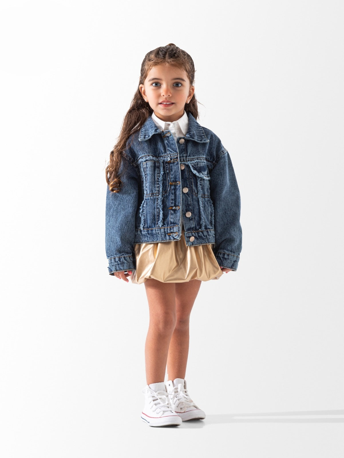أضيفي لمسة من التميز إلى خزانة ملابس طفلك مع هذه السترة الجينز الفاخرة. تم تصميم هذه القطعة بعناية فائقة لتجمع بين الأناقة الكلاسيكية لملابس "الدينيم" وبين الراحة التي يحتاجها طفلك أثناء الحركة واللعب.