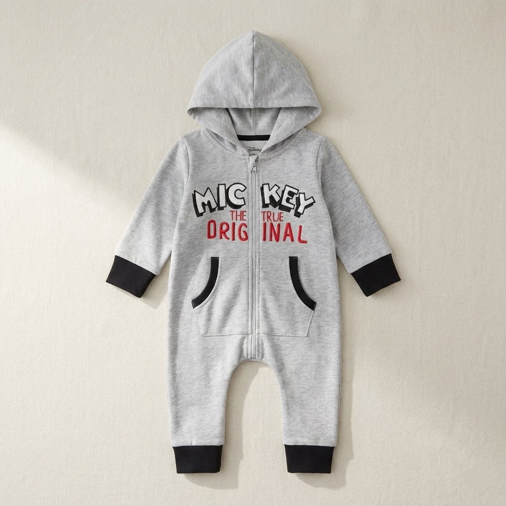 جمبسوت رمادية بتصميم "ميكي ماوس" مع غطاء للرأس وسحاب أمامي