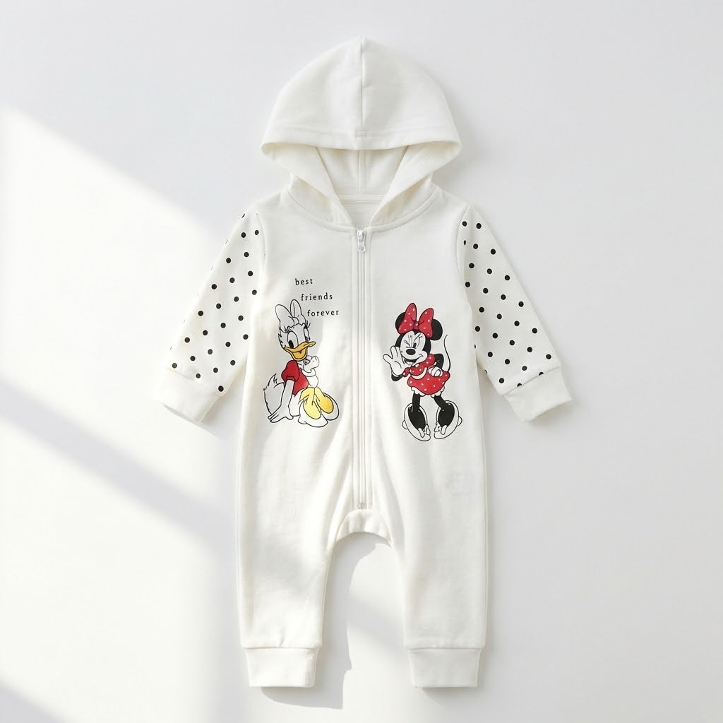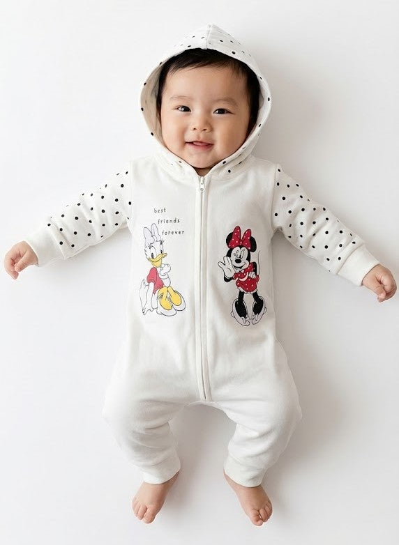 رومبر أطفال قطني باللون الأبيض مع غطاء للرأس - تصميم "ميني ماوس" و"ديزي داك"