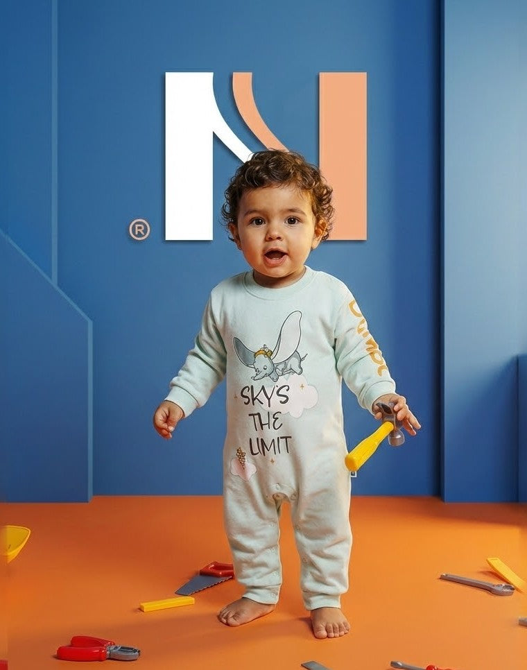 يتميز هذا الرومبر (السالوبيت) بتصميم عصري وجذاب يجمع بين نعومة الملمس وروعة التفاصيل. يأتي بلون "مينت" هادئ ومريح للعين، مع طباعة عالية الجودة لشخصية "دامبو" المحبوبة وعبارة "Sky's The Limit" الملهمة، مما يجعله قطعة لا غنى عنها في خزانة طفلك