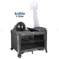 سرير ومنطقة لعب كيديلو T-703M المتعدد الوظائف للأطفال - سرير جانبي، طاولة تغيير، ونظام تنقل متكامل (رمادي فاخر)