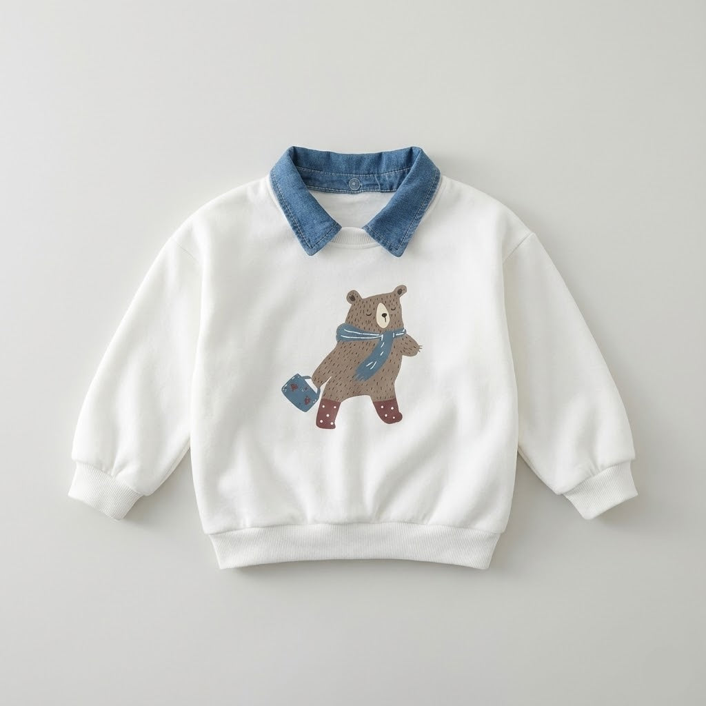 سويت شيرت شتوي للأطفال باللون الأبيض مع ياقة جينز وطبعة الدب الأنيق