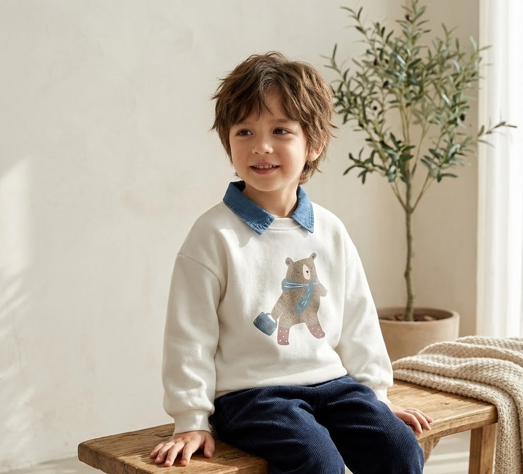 امنحي طفلك إطلالة شتوية تجمع بين البراءة والأناقة مع هذا السويت شيرت المتميز. يتميز التصميم بلون أبيض نقي وهادئ، مع ياقة من الجينز الأزرق تضفي لمسة كلاسيكية راقية (ستايل القميص)، وتتوسطه رسمة فنية لطيفة لدب يرتدي وشاحاً شتوياً، مما يضفي طابعاً مرحاً ومحبباً للأطفال