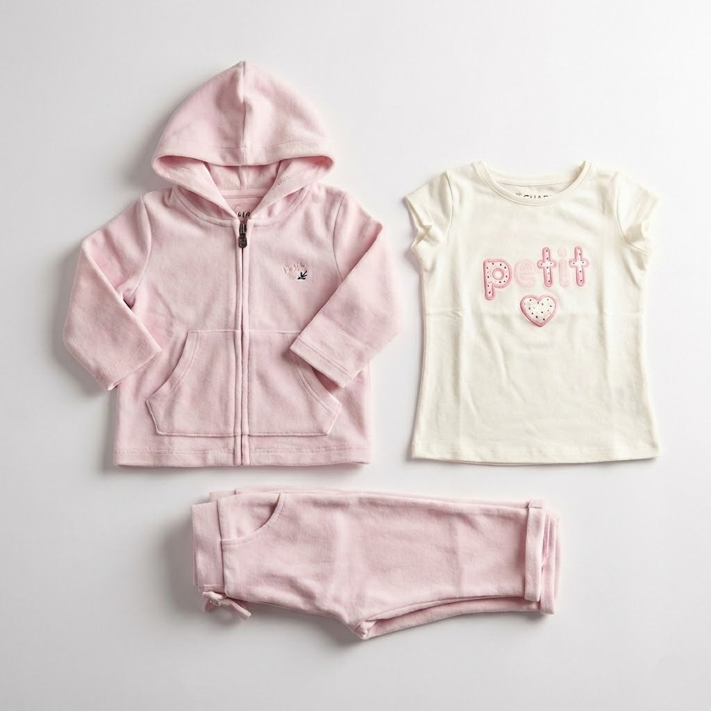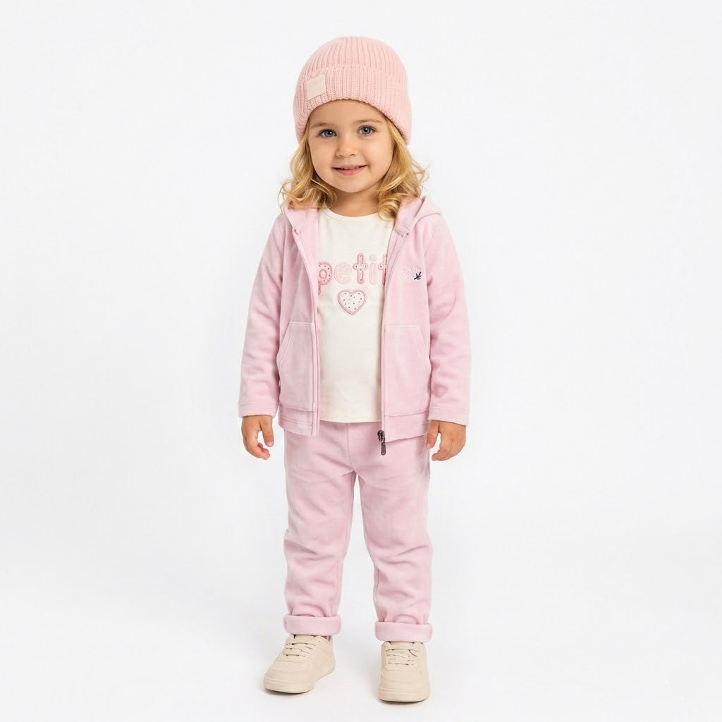 طقم أطفال "بيتي" ثلاثي القطع: سويت شيرت بغطاء رأس و شيرت وبنطال مريح باللون البينك