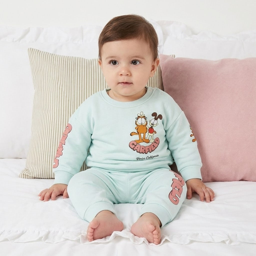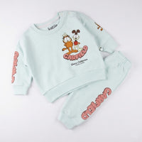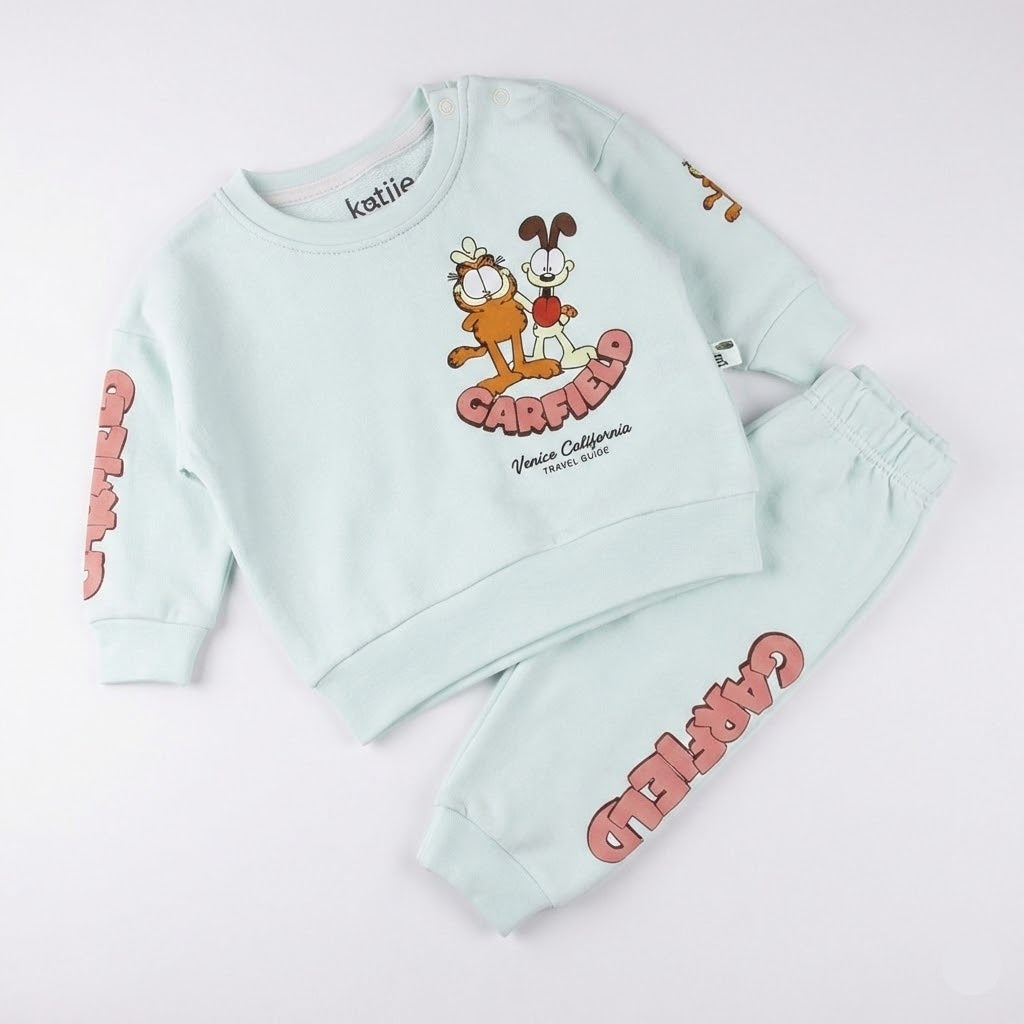 طقم أطفال قطن - سويت شيرت وبنطلون بطبعة جارفيلد المميزة (لون منت جرين)