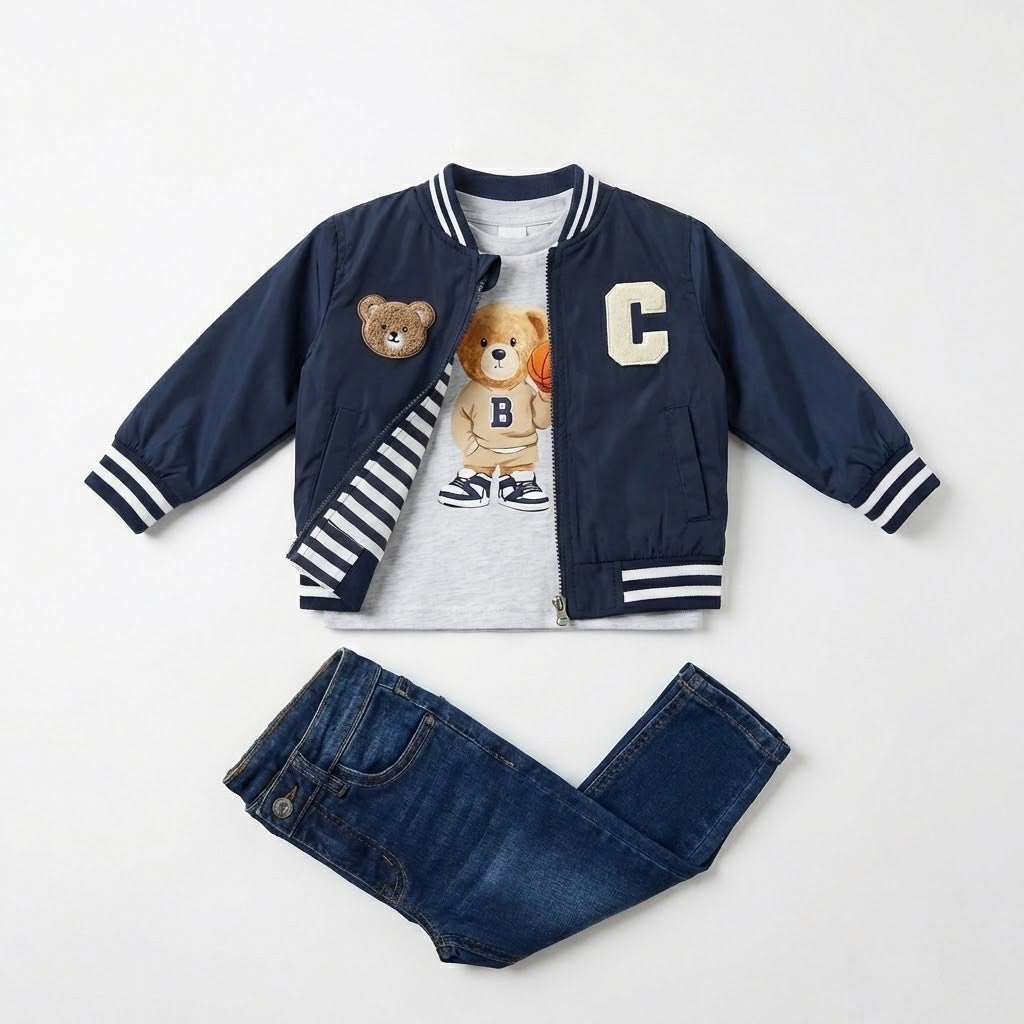 طقم أولادي كاجوال (3 قطع): جاكيت بومبر أنيق، تيشيرت بتصميم الدب الرياضي، وبنطال جينز