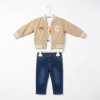 طقم أولادي كاجوال (3 قطع): جاكيت بومبر بيج أنيق، تيشيرت بتصميم الدب الرياضي، وبنطال جينز