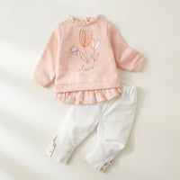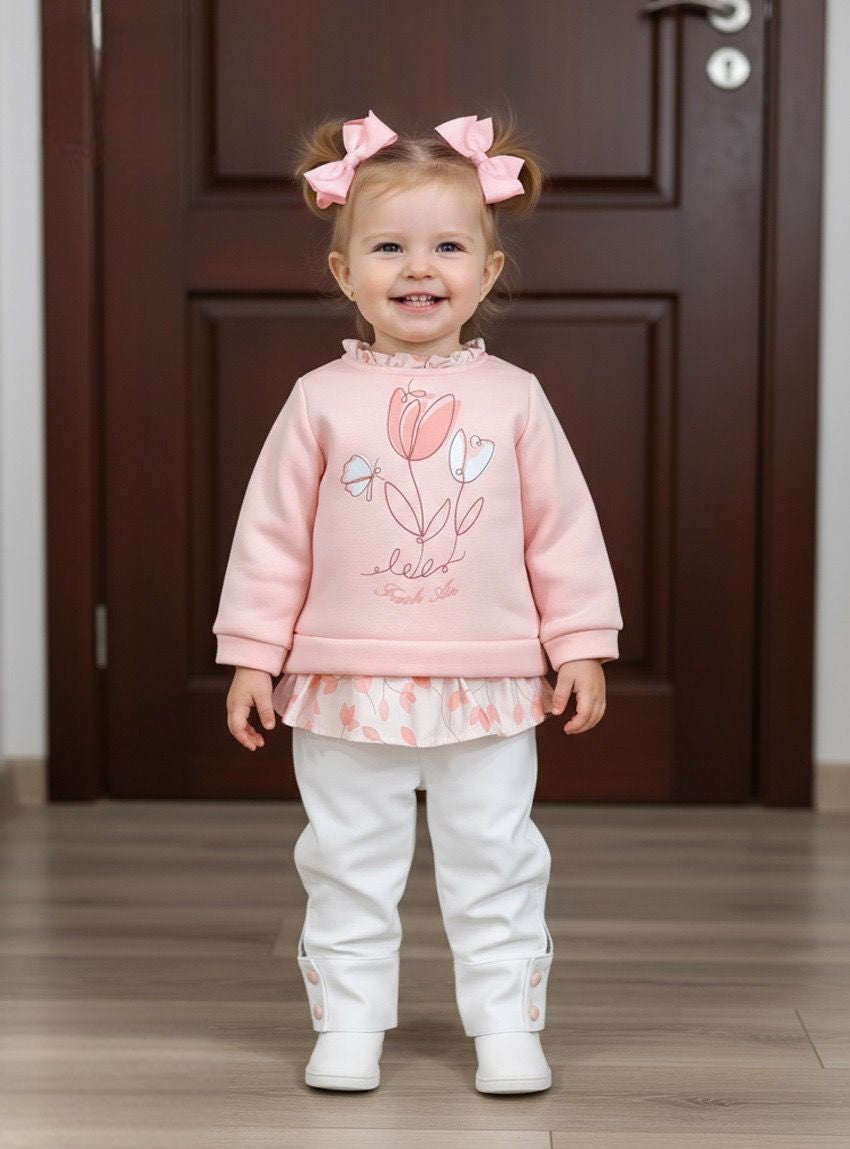 طقم بناتي - سويت شيرت وردي برسومات الزهور مع بنطلون أبيض