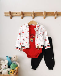 طقم بيجامه بيبي 3قطع جاكيت بووه ابيض احمر