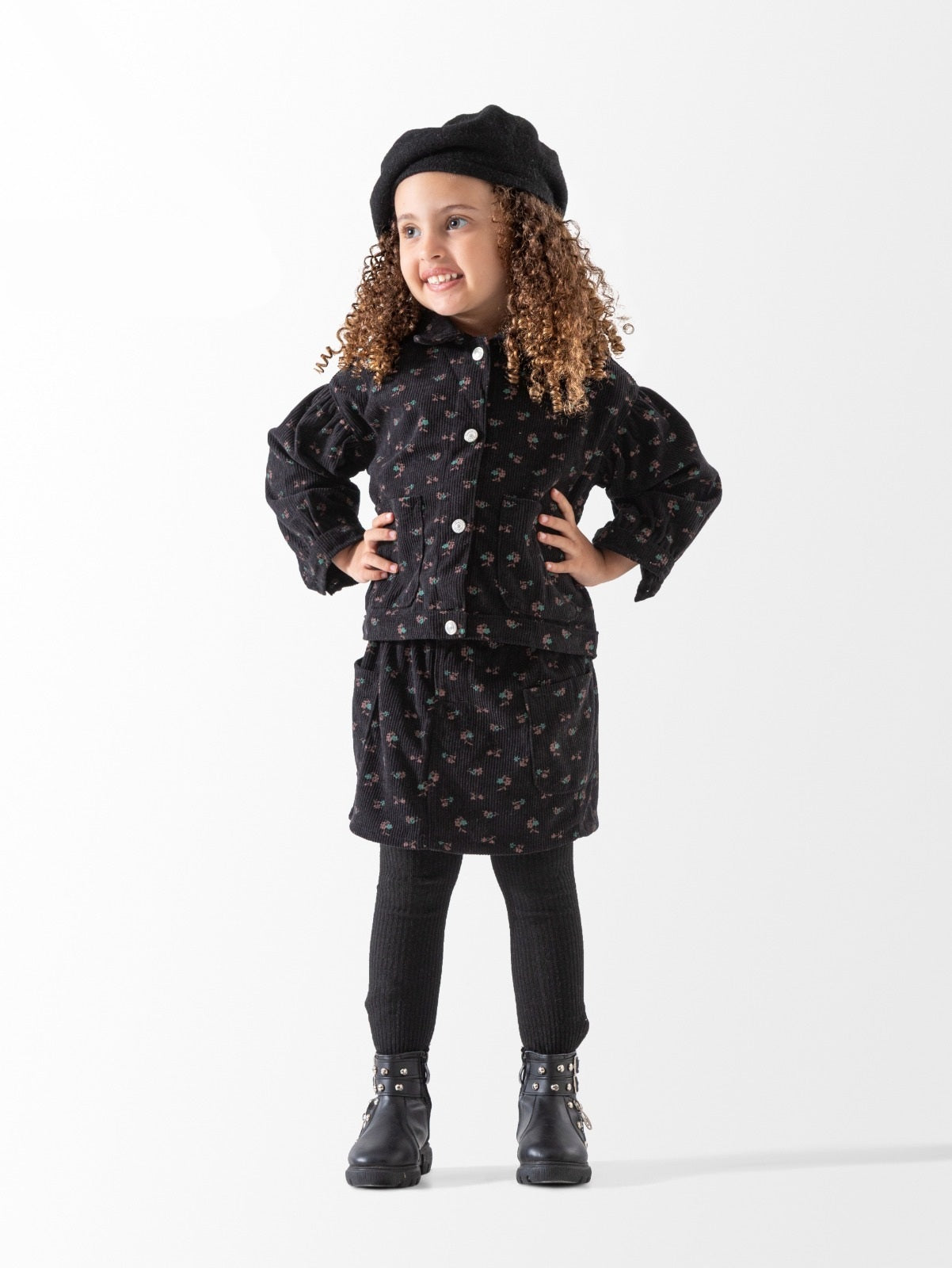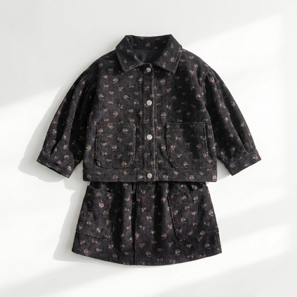 طقم شتوي أنيق للبنات (جاكيت وتنورة) من المخمل المضلع بنقشة الزهور