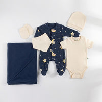 تم تصميم هذا الطقم خصيصاً لحديثي الولادة، من أجود أنواع القطن 100% ليضمن ملمساً فائق النعومة على بشرة طفلك الحساسة. يتميز الطقم بلون ازرق هادئ مع نقوشات رقيقة مستوحاة من الطبيعة ، مما يجعله خياراً مثالياً كطقم خروج للمستشفى أو كهدية قيمة للمواليد الجدد.
