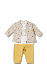 Dress your little one in cozy comfort with this charming baby outfit set. Featuring a soft, plush cardigan adorned with playful multi-colored polka dots, it's perfect for adding a touch of sweetness to any day. The cardigan pairs perfectly with a crisp white long-sleeve tee that showcases an adorable textured bear appliqué, adding a delightful tactile element. Completing the look are comfortable mustard yellow trousers, crafted from a gentle fabric that ensures ultimate softness against delicate skin. This set is designed for both style and comfort, making it an ideal choice for everyday wear or special occasions.