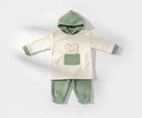 "Adorable and cozy, this two-piece baby outfit features a soft, cream-colored hoodie with sage green accents. The hoodie showcases a charming teddy bear peeking out from a front pocket, adding a playful touch. Paired with comfortable sage green pants, this set is crafted from a plush, gentle fabric, ensuring warmth and comfort for your little one. Perfect for everyday wear or special outings, this outfit combines cuteness with practicality."