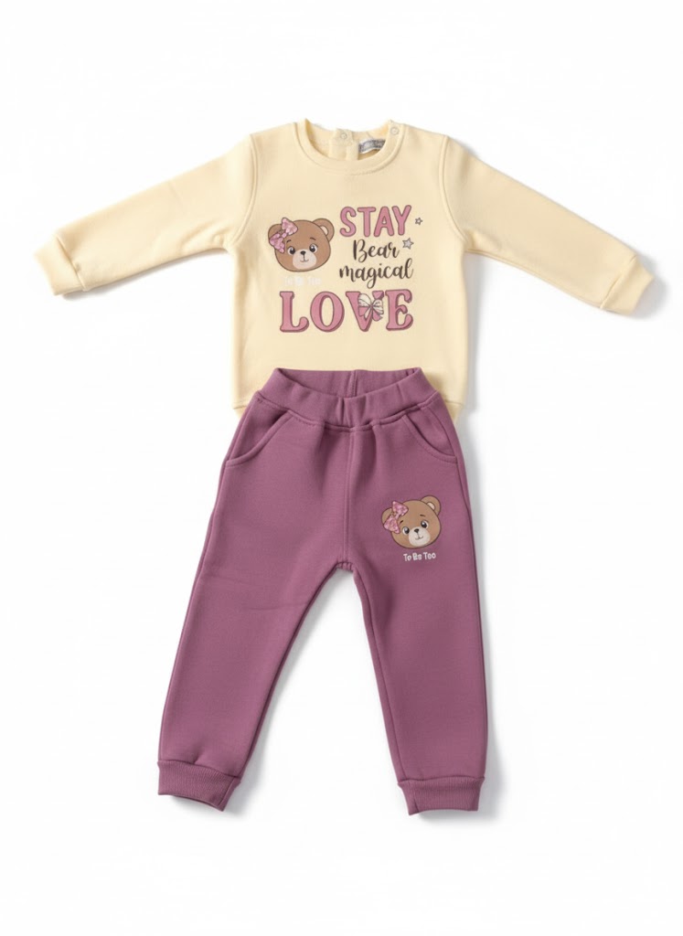 This adorable "To Be Too" two-piece set is perfect for your little one, combining comfort with charming style. The soft, long-sleeved top features a cute bear graphic with a bow, accompanied by the sweet message "STAY Bear magical LOVE." Its gentle cream hue provides a lovely contrast to the vibrant purple pants, which also sport a matching bear emblem on the hip. Crafted from plush, soft fabric, this outfit ensures maximum comfort for your baby's delicate skin,