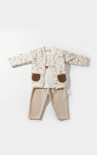 Dress your little one in comfort and style with our charming Cloud Print Cardigan Set. This delightful 3-piece outfit is designed for ultimate softness and warmth, making it perfect for everyday wear, playful adventures, or cozy cuddles.