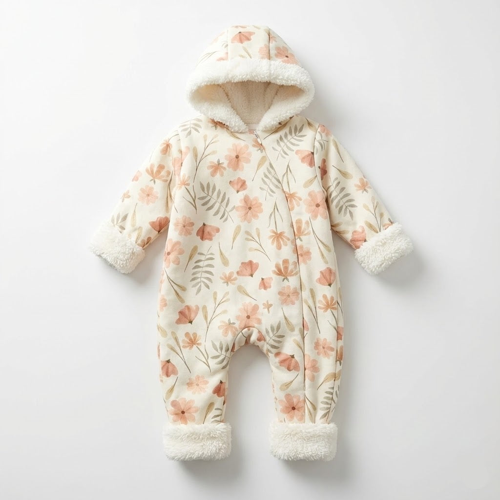 This adorable baby romper features a charming floral and leaf print in soft muted tones on a cream background. Designed for comfort and warmth, it is fully lined with plush white sherpa fleece, visible at the hood, cuffs, and ankle trim. The hooded design and front zipper closure ensure a cozy fit and easy changes. Perfect for keeping your little one warm during cooler days.