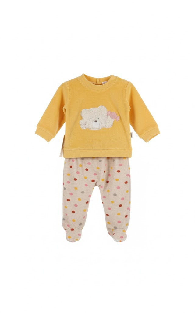 Dress your little one in comfort and style with this adorable baby sleepsuit and pants set. The soft yellow velour top features a charming white teddy bear appliqué with a sweet pink bow, adding a touch of playful cuteness. Paired with cozy footed pants adorned with colorful polka dots in pink, yellow, and beige, this outfit is perfect for naptime, playtime, or snuggles. Made from soft, gentle fabric, it ensures your baby stays comfortable all day long. The footed design keeps tiny toes warm, making it an ideal choice for cooler days.