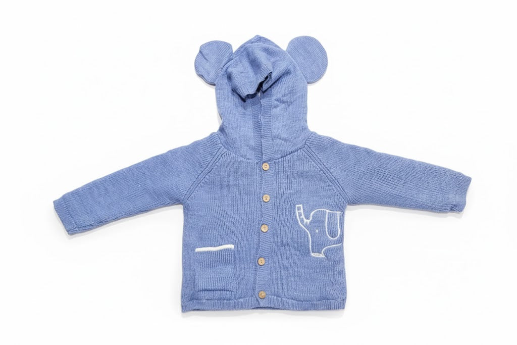 كارديغان صوف بغطاء رأس بتصميم فيل لطيف للأطفال - أزرق (قطعة مثالية لدفء وأناقة طفلك)