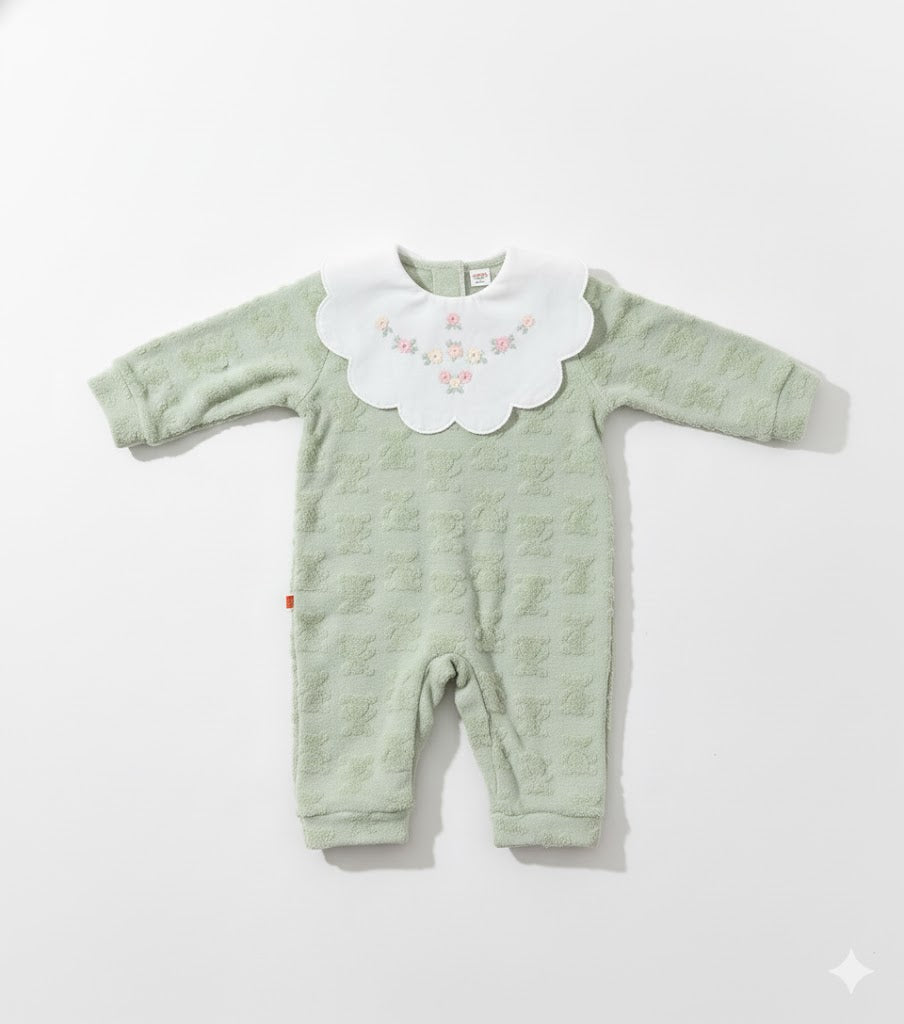جمال الطبيعة في قطعة واحدة! 🌿🌸 دللي طفلك برومبير "Enchanted Garden" بلونه الأخضر الساحر ونقشة الدبابيب البارزة. الياقة المطرزة بزهور الربيع تعطي طفلك طلّة كلاسيكية فخمة، والخامة ناعمة مثل الحضن الدافئ. ✅ خامة مخملية "Plush" ناعمة جداً. ✅ ياقة مطرزة بتفاصيل دقيقة. ✅ تصميم يجمع بين الأناقة والراحة القصوى.