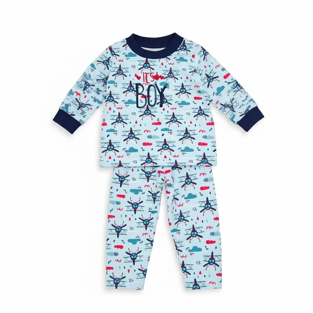Celebrate your little pilot's arrival with this adorable "It's a Boy" airplane print pajama set! This charming 2-piece sleepwear features a sky blue background covered in a playful pattern of red and blue airplanes, propeller motifs, and fluffy clouds. The long-sleeve top proudly declares "It's a Boy" in a stylish font, making it perfect for announcing a new arrival or simply for sweet dreams. Crafted from soft, breathable cotton, this pajama set ensures comfort throughout the night for your baby boy.