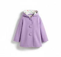 Snuggle up in style! This adorable purple hooded jacket is crafted from a soft, plush fabric that feels gentle against the skin. Featuring three large, perfectly matched buttons down the front and a charming patterned lining inside the hood. The relaxed, laid-flat fit makes it perfect for layering, offering both warmth and a chic look for any outing.